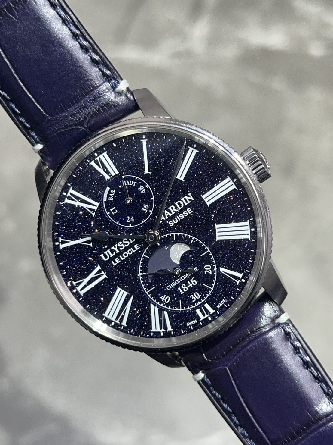 The dial is sparkling blue aventurine, and the double counter features a power reserve at 12 o’clock and a small second and moon phase display at 6 o’clock.