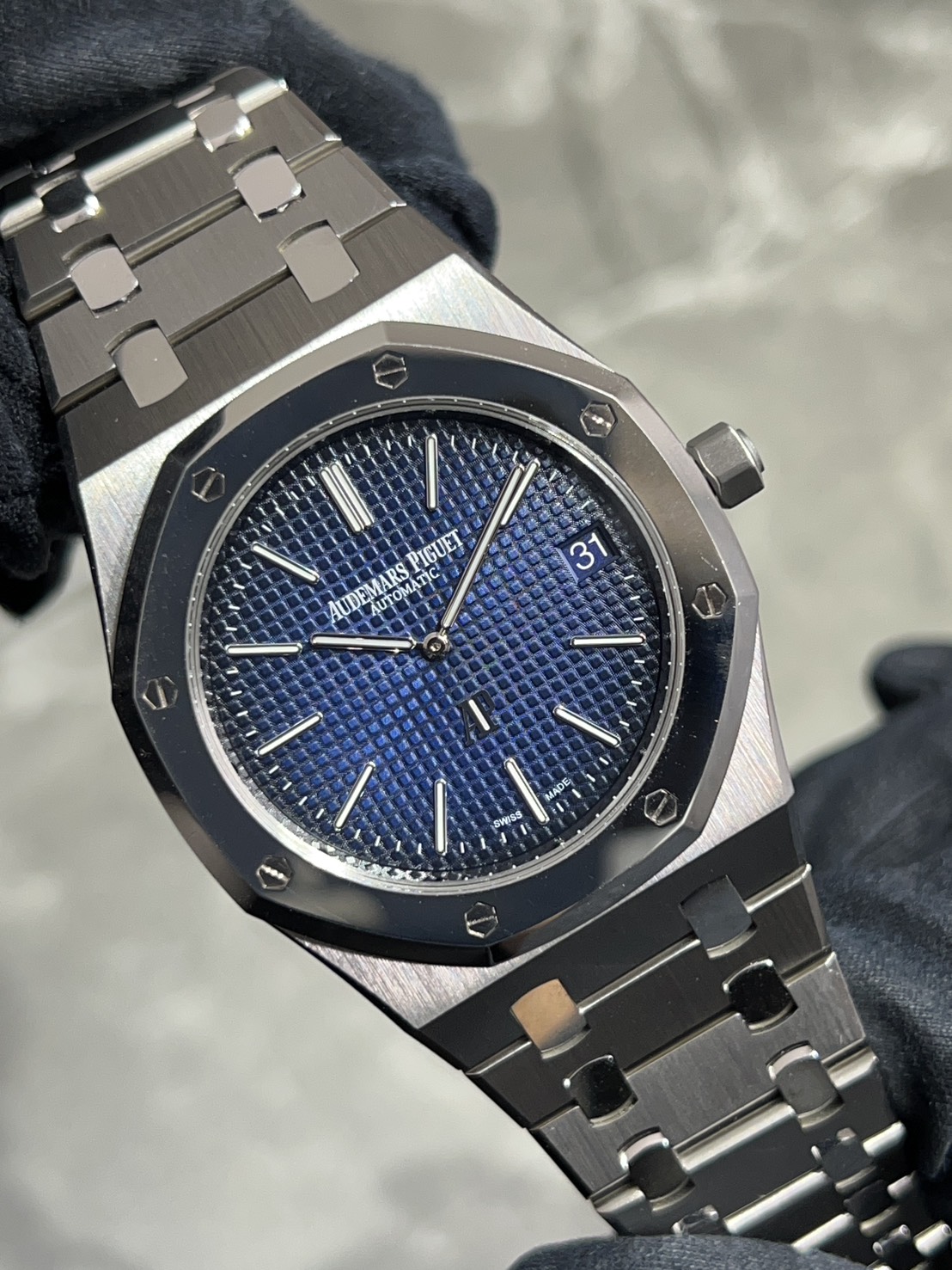 This Extra-Thin, a perfect reproduction of the original Royal Oak released in 1972, is a coveted watch for Audemars Piguet fans, and is a rare model with a titanium case and platinum bezel.